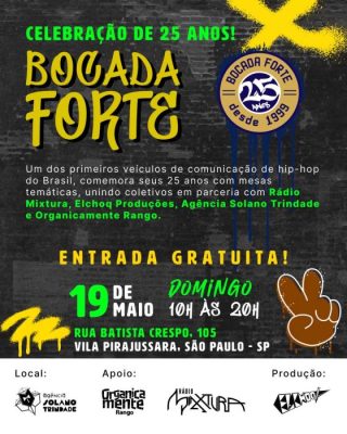 Em maio de 2024 o Bocada Forte completa 25 anos de caminhada e iremos celebrar essa marca em um evento realizado com o apoio e parceria da Agência Solano Trindade, do restaurante Organicamente Rango, da Rádio Mixtura, do Hub Criativo e da El Choq Produções.