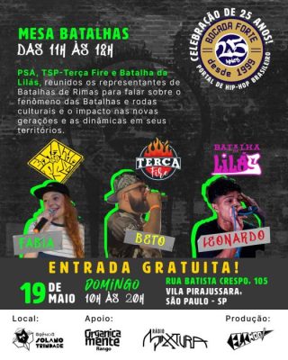 11h às 12h – Mesa Batalhas de Rima com Beto (Terça Fire-TSP), Fábia (PSA) e Leonardo (Batalha da Lilás);