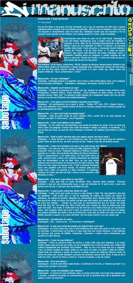 A entrevista é curta, bem descontraída e foi um recorde de acessos no início da década de 2000. O Sabota estava no auge. Na época, eu estava andando pelo centro de São Paulo quando escutei a entrevista em algum lugar. Quando fui conferir, era um camelô vendendo CD pirata do Sabotage. Uma das faixas bônus era essa entrevista.