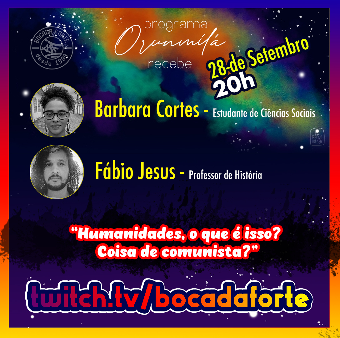 O Programa Orunmilá chega a sua 4ª Edição e mais uma vez traz à tona assuntos atuais e relevantes. Hoje, à partir das 20h, ao vivo em nosso canal na Twitch, Lucièné Cortes e Gisele Moura tratarão do tema ‘Humanidades’ ou ciências humanas. Para refletir, debater e entender o tema, elas contarão com a presença de Barbara Cortes e Fábio Jesus.