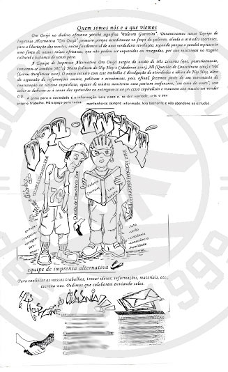 Resolvi escrever sobre isso pra registrar algo que acredito que nunca escrevi. Entre todas essas referências e inspirações para seguir esse caminho, seguir na contra mão, tem uma que é muito importante, a Equipe de Imprensa Alternativa Oro Onijá. Formada por três mulheres, verdadeiras GUERREIRAS DA PALAVRA, em ordem alfabética: Alê, Mara e Val. Cada uma tinha o seu fanzine, o da Alê era o Questão de Consciência, o da Mara era o Hip Hop e Cidadania e o da Val era o Letras Periféricas. Depois delas começarem essa caminhada com os zines e espalharem conhecimento pra todo país, elas começaram a fazer Rap também. A Mara eu sei que fez parte de outros grupos, mas juntas elas formavam o Culturalmentes, até cantaram em um dos eventos do Bocada Forte lá no Jardim Monte Azul (zona sul de SP), o Hip Hop no Monte.