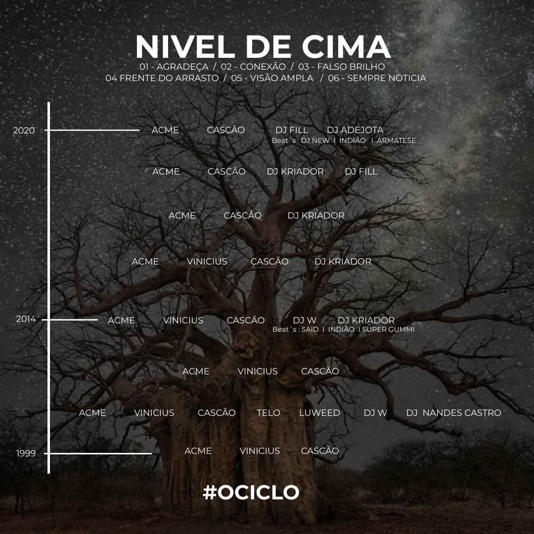 Formado em 1999 na cidade de Mogi das Cruzes (SP), o grupo Nível de Cima segue em atividade e acaba de lançar um EP com o título ‘O Ciclo’. Hoje o grupo é um quarteto formado pelos fundadores Cascão e Acme juntamente com os DJs Adejota e Fill, esses dois últimos eram fãs do grupo e acabaram entrando para a formação.